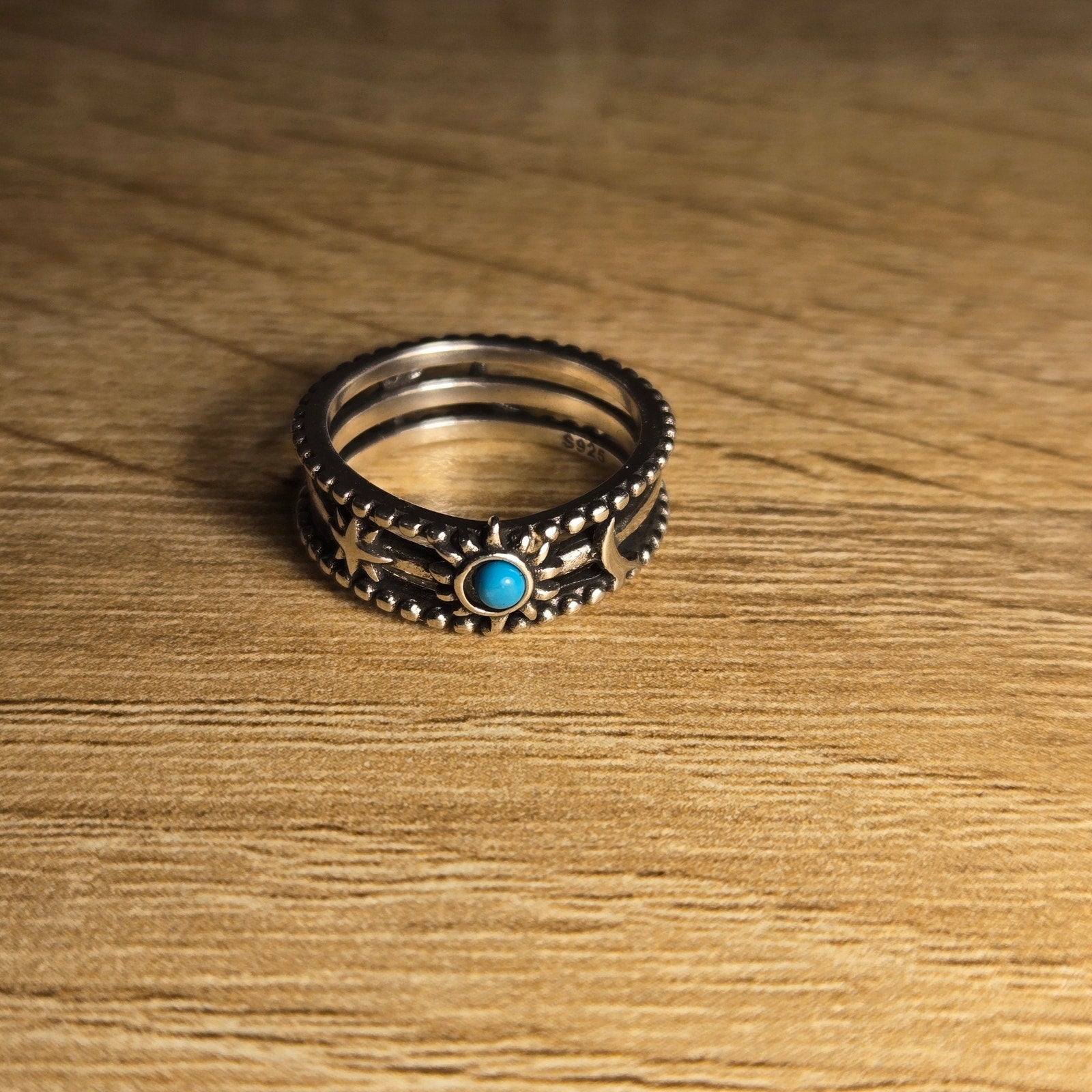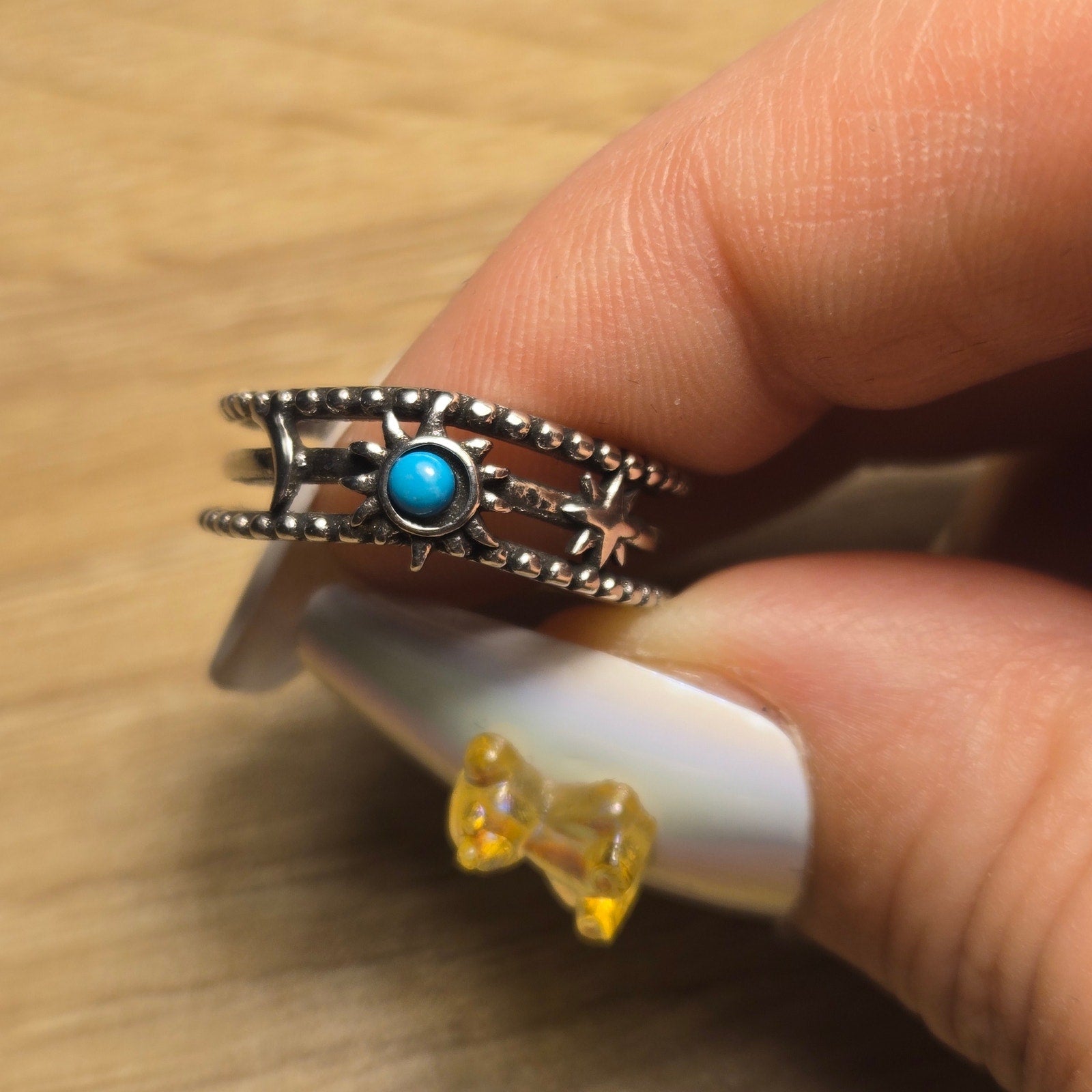 #CelestialJewelry #SterlingSilverRing #BohoStyle #TurquoiseRing #SunMoonStars #FestivalJewelry #925Silver #AlterNativEra #CosmicStyle #StatementRing #Size6Ring