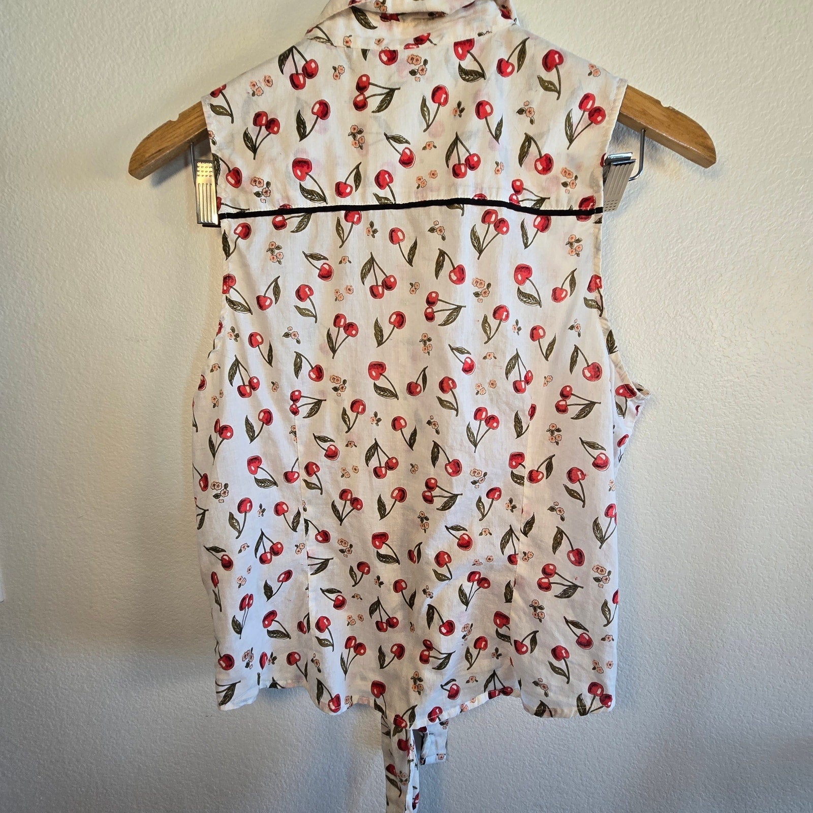 Serve up retro soda-fountain charm with this Y2K-era Forever 21 cherry print sleeveless blouse. It’s soft, crisp, and flirty with a tie-front hem and black piping that gives it a rockabilly wink. Wear it to the farmers market, a picnic, or while you dramatically sip cherry cola with cat-eye sunglasses.