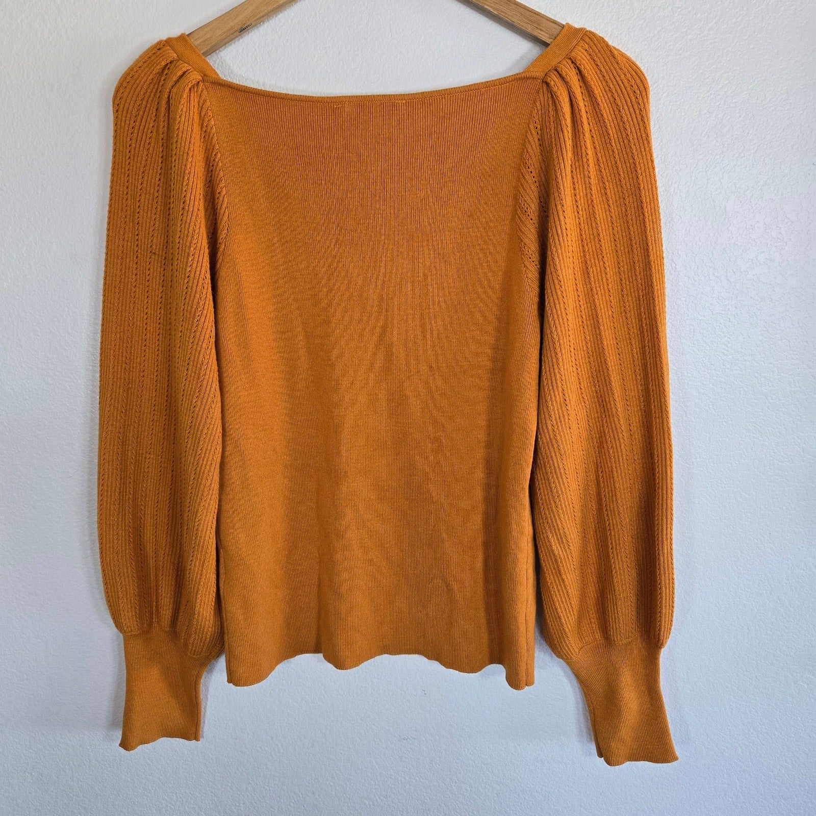A cozy fall favorite with standout details, this mustard yellow ribbed sweater from Calligraphie blends softness and structure. Features a sweetheart neckline with subtle ruching at the chest, paired with voluminous balloon sleeves that taper at the wrists and feature a unique leaf-textured knit detail. Made of a soft blend with stretch for comfort—perfect for layering or a statement on its own.