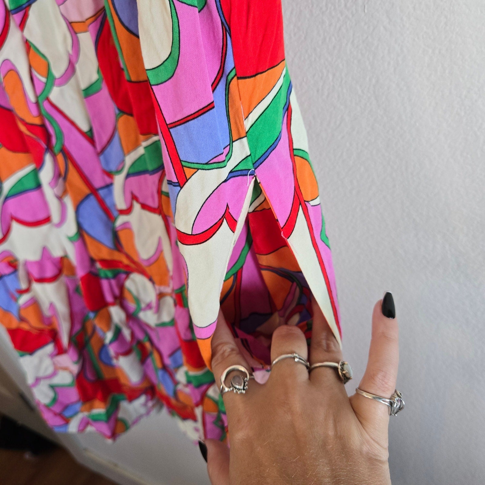 A playful and funky mid-century inspired babydoll dress in an abstract print that screams "retro clowncore chic." This piece features multicolor swirls of red, pink, green, cream, and blue in bold brushstrokes. Finished with fabric-covered buttons down the chest, double-tiered ruffles, and roomy hidden pockets. 100% rayon with great drape and flow. Ideal for mod lovers, funky dressers, or anyone ready to be the main character.