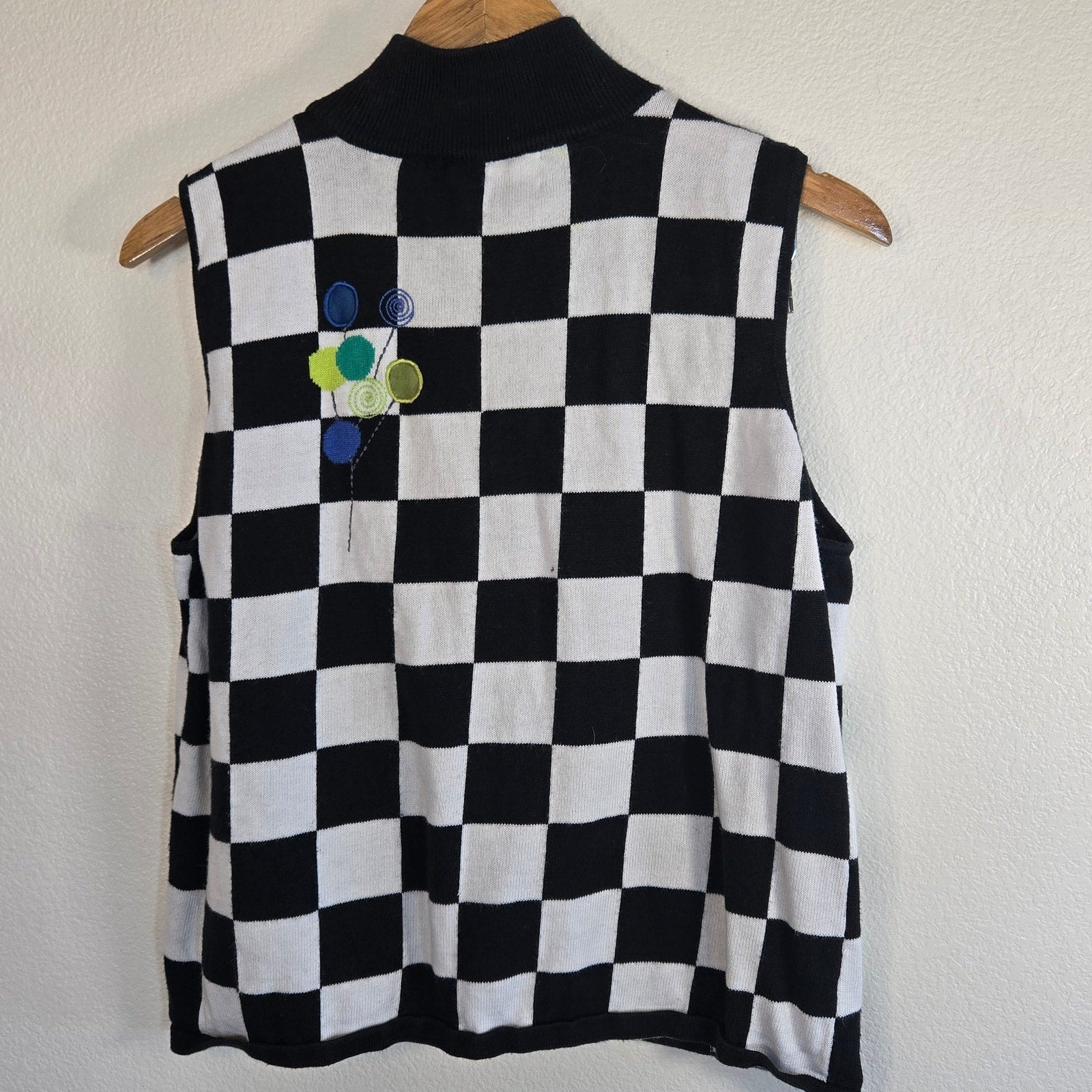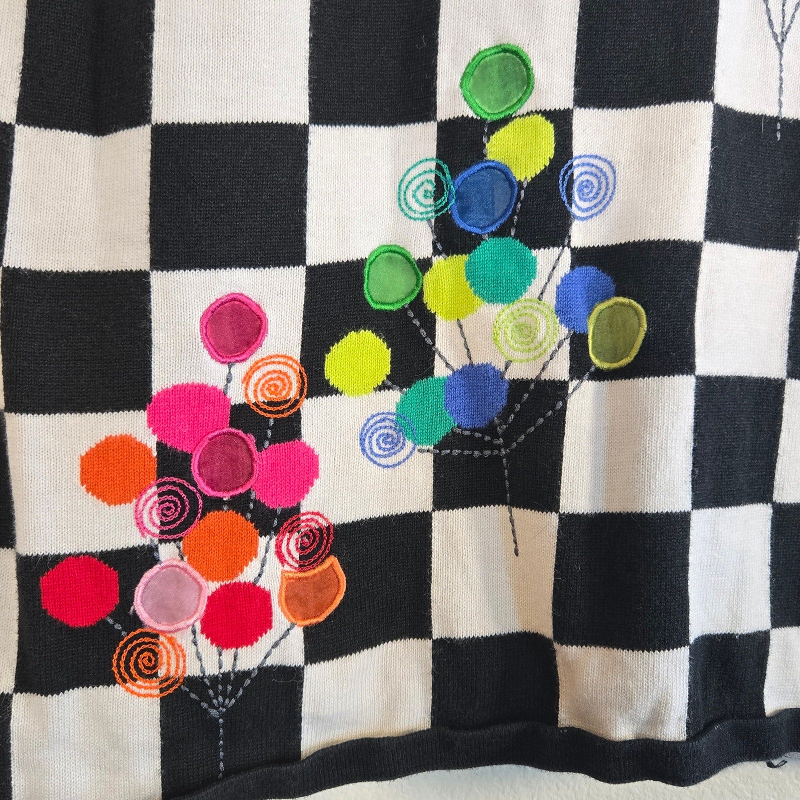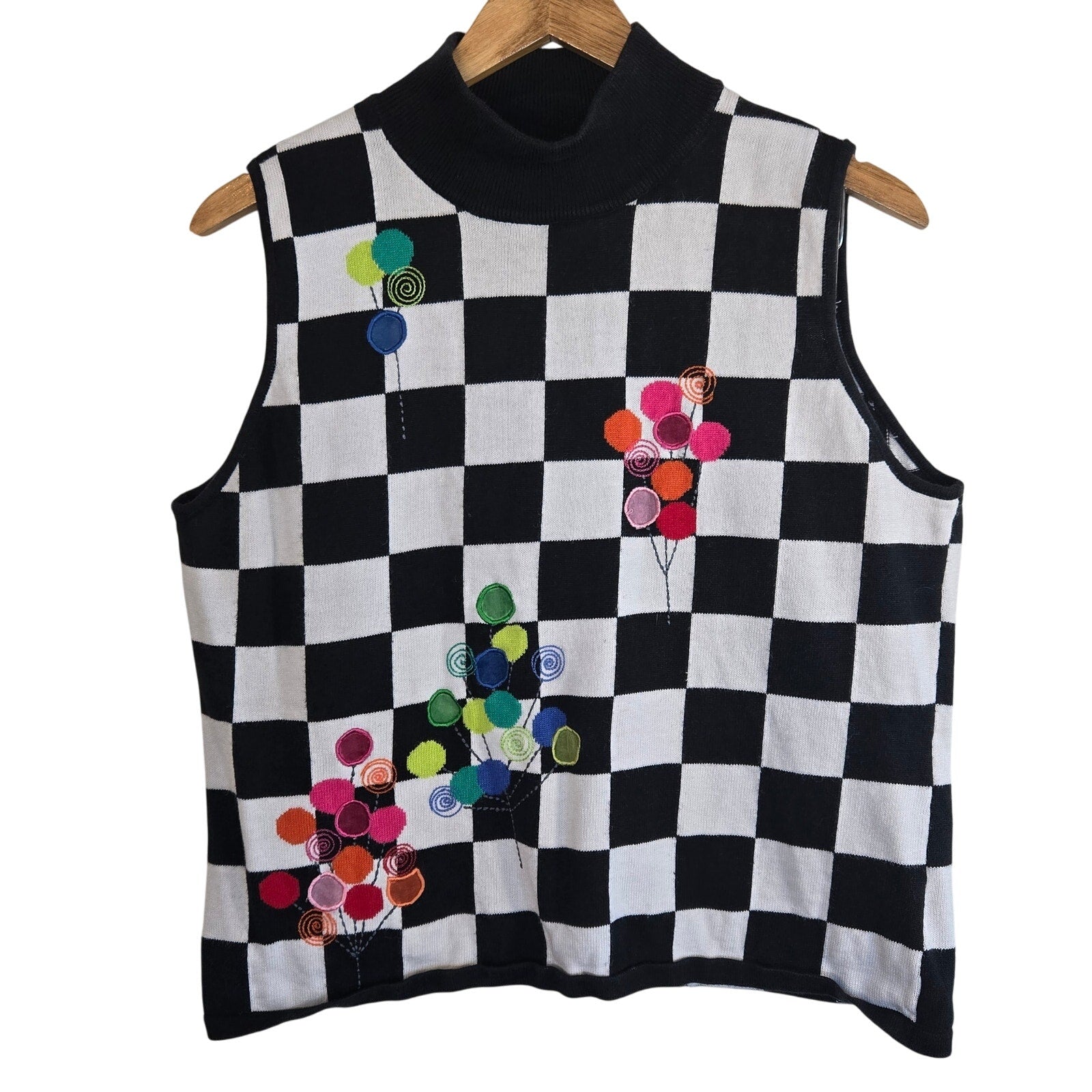 Rare and playful knit tank by Marissa Christina featuring a black-and-white checkered base with colorful embroidered balloon clusters. Pink/orange/red and blue/green/yellow groups of abstract spirals and circles pop off the soft knit. Textured mesh panels in some balloons add extra dimension. Features a mock turtleneck and stretch for comfort. Unique 90s/Y2K piece in excellent condition.